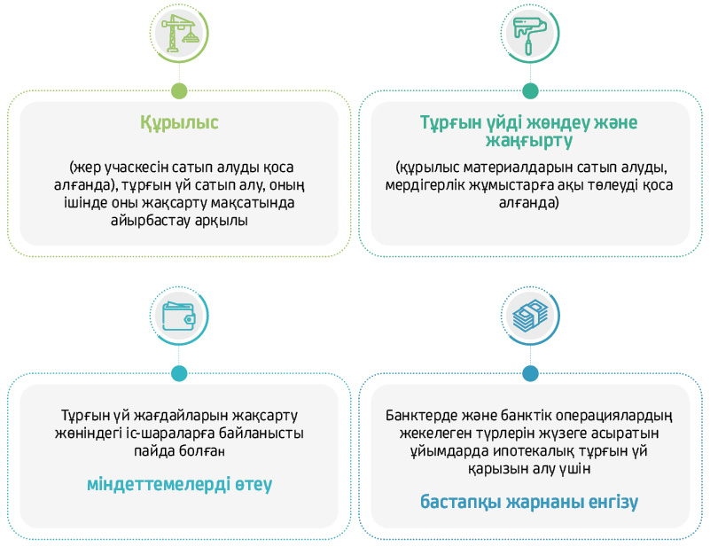 Банк өз салымшыларына тұрғын үй жағдайларын жақсарту жөніндегі іс-шараларды орындау үшін тұрғын үй, аралық және алдын ала тұрғын үй қарыздарын ұсынады, атап айтқанда: