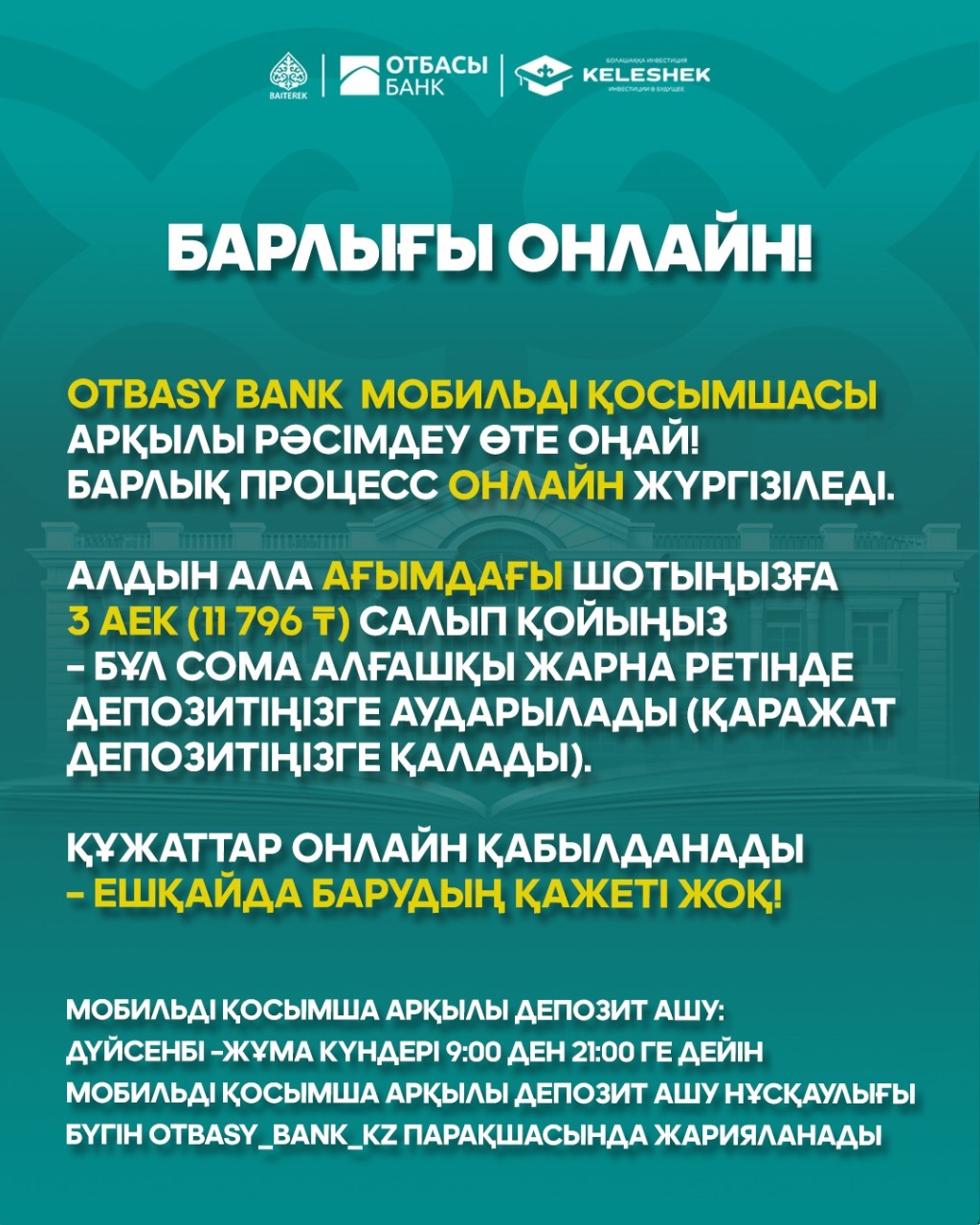 Құрметті клиенттер! 16 желтоқсан 2025 жылы Отбасы Банкінің байланыс орталығы жұмыс істемейді. Осы уақытта сіз Quanysh-Ai жеке кеңесшісінің тəулік бойы қызметін пайдалана аласыз. Бізге WhatsApp-қа +7 705 925 13 01 нөміріне жазыңыз, біз барлық сұрақтарыңызға қуана көмек көрсетеміз! Сіздің Отбасы Банк