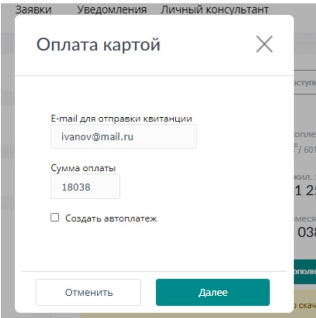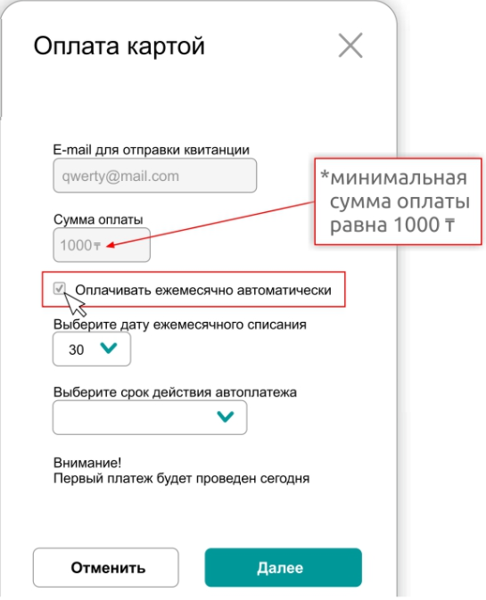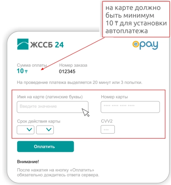 5) Необходимо заполнить реквизиты платежной карты. Если установить текущую дату, то на карте должна быть вся сумма автоплатежа.